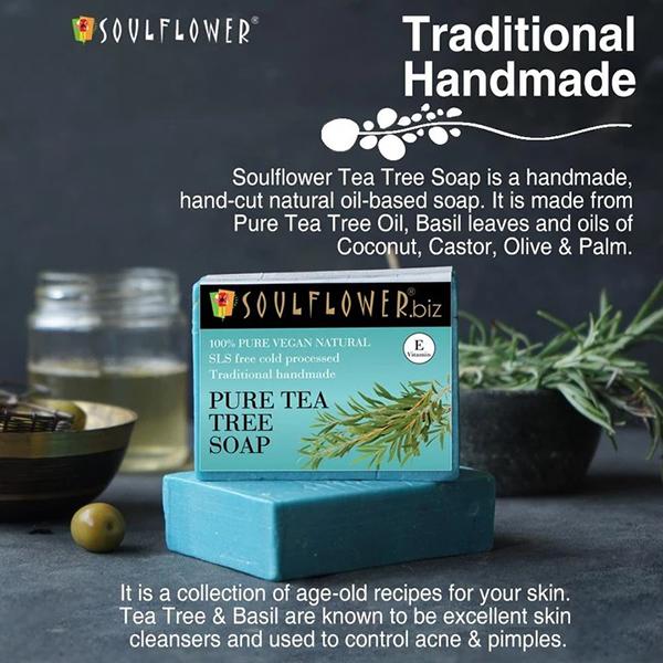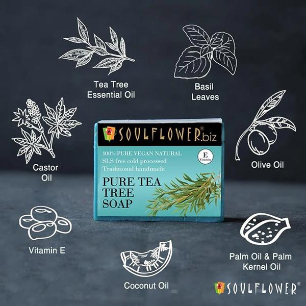 100% Pure, Natural, Vegan, and Cold Processed Soulflower Pure Tea Tree Soap is a handmade hand cut natural oil-based soap. It is made from Pure Tea Tree Oil, Basil leaves, oils of Olive, Castor, Coconut and Palm with Vitamin E.