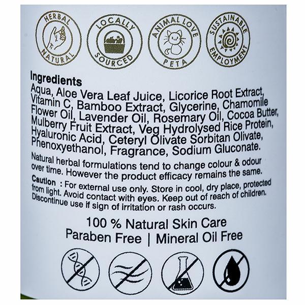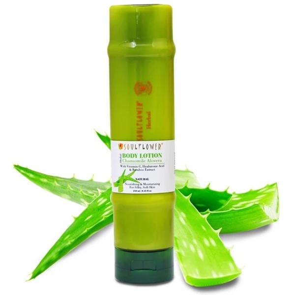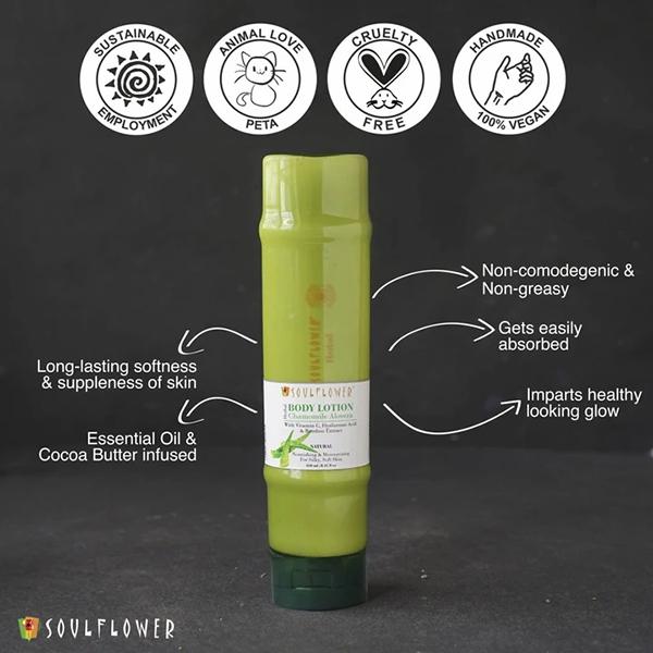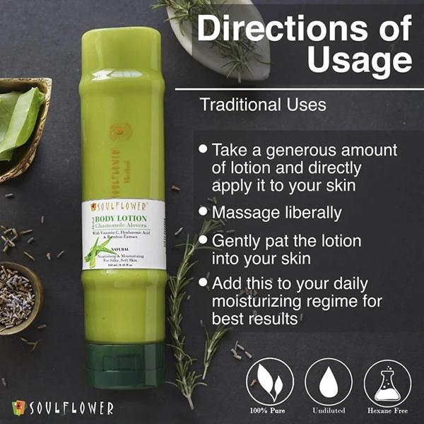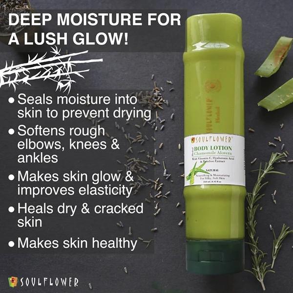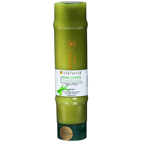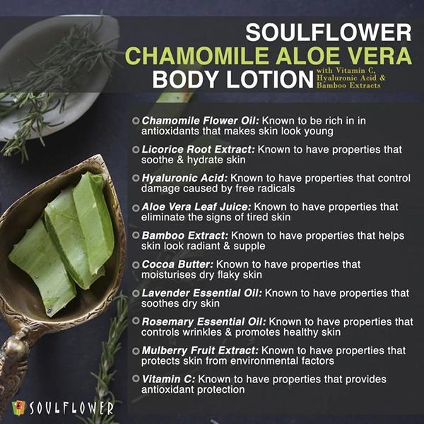 Make your skin feel instantly nourished and pampered with Soulflower Herbal Body Lotion with Chamomile and Aloe Vera. It’s infused with pure organic and powerful natural ingredients that provide moisturization and protect skin from free radicals that threaten to damage and dull your skin. Soulflower body lotion doesn't just add water back into your skin, it also traps in the water you already have to plump it up and protect skin. This lotion goes beyond defending your skin to further boost its softness and brightness, while calming it down and improving elasticity. As an extra boon, you are left with light scent of bamboo.