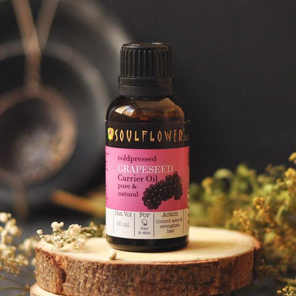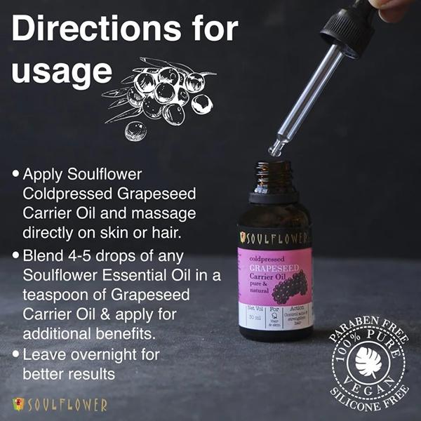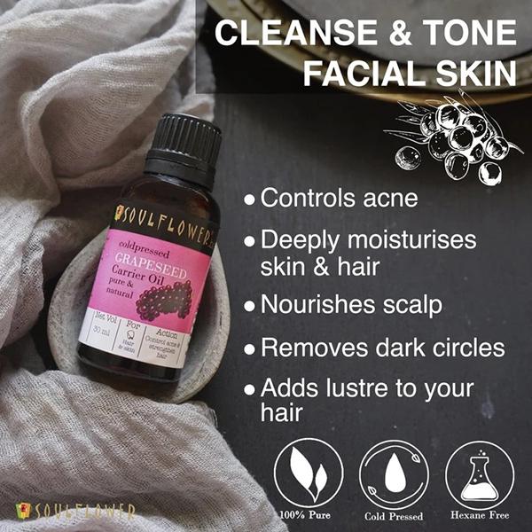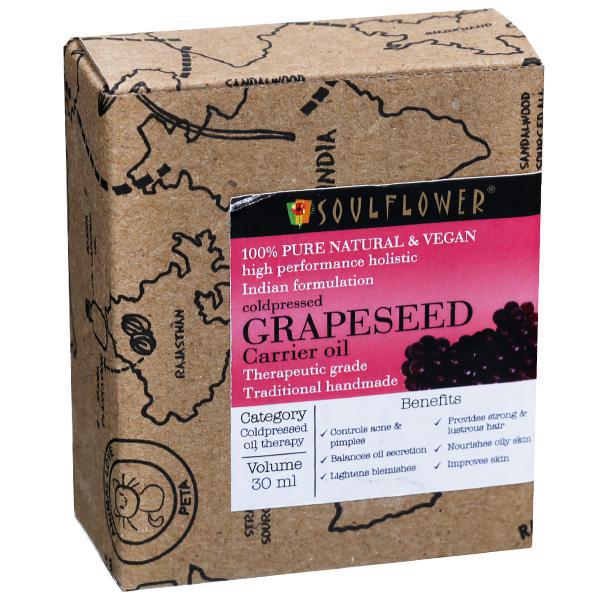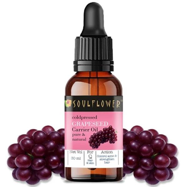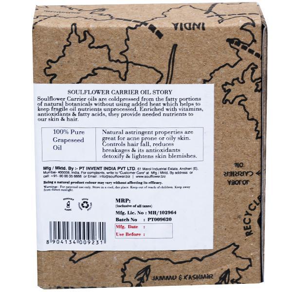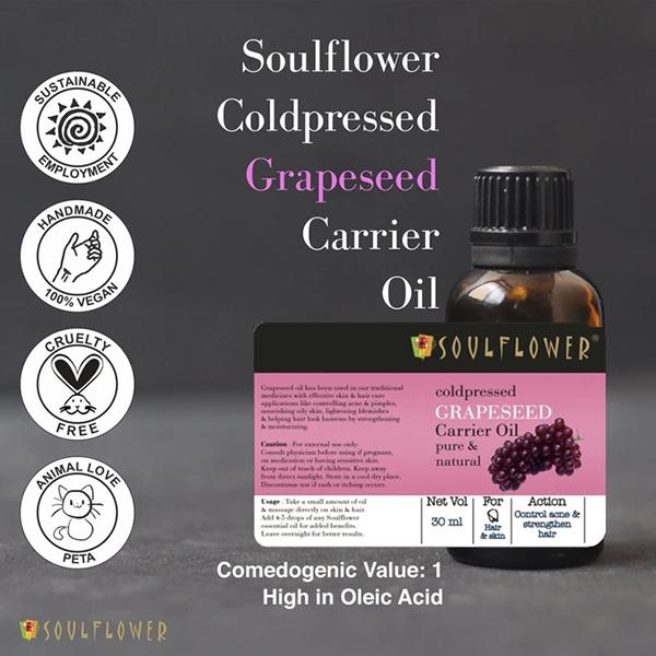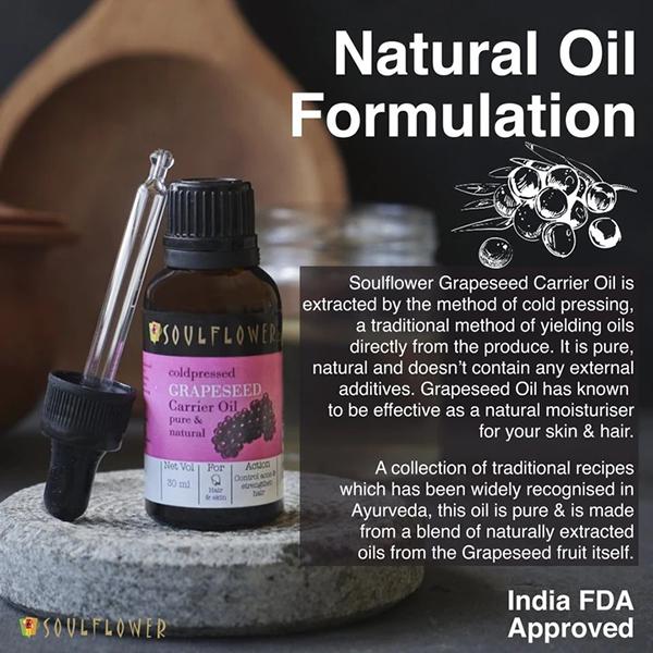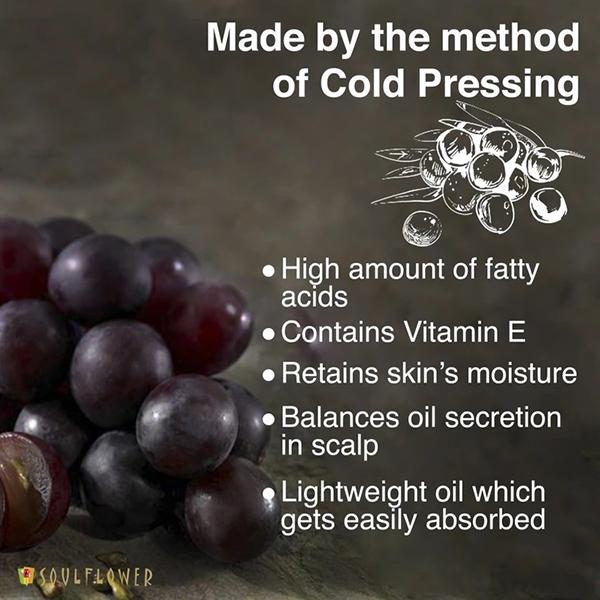 Soulflower Grapeseed oil is extracted by the method of cold pressing, a traditional method of yielding oils directly from the produce. It is pure, natural & doesn't contain any external additives. Grapeseed Oil has known to be effective as a natural moisturizer for your skin & hair.