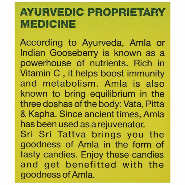 Product Information - According to Ayurveda, Amla or Indian Gooseberry is known as a powerhouse of nutrients. Rich in Vitamin C, it helps boost immunity and metabolism. Amla is also known to bring equilibrium in the three doshas of the body: Vata, Pitta & Kapha. Since ancient times, Amla has been used as a rejuvenator. Sri Sri Tattva brings you the goodness of Amla in the form of tasty candies. Enjoy these candies and get benefitted with the goodness of Amla.