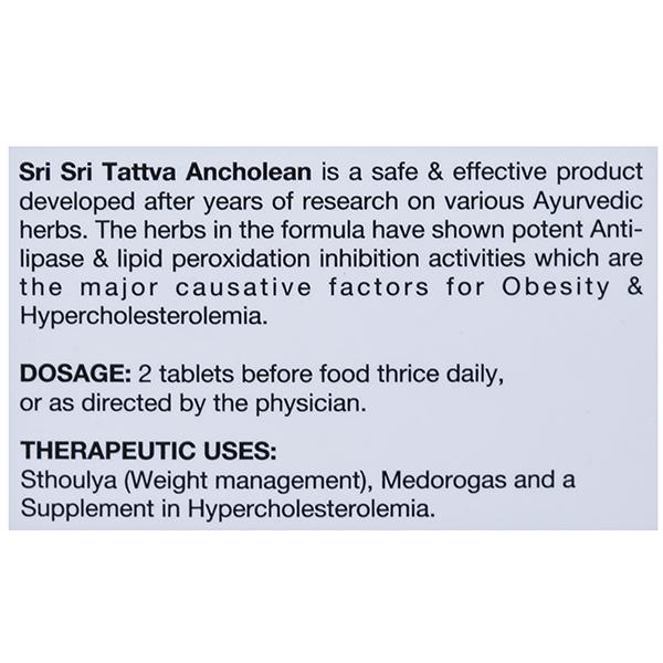 Sri Sri Tattva Ancholean is a safe & effective product developed after years of research on various Ayurvedic herbs. The herbs in the formula have shown potent Anti-lipase & lipid peroxidation inhibitation activities which are the major causative factors for obesity & Hypercholesterolemia.