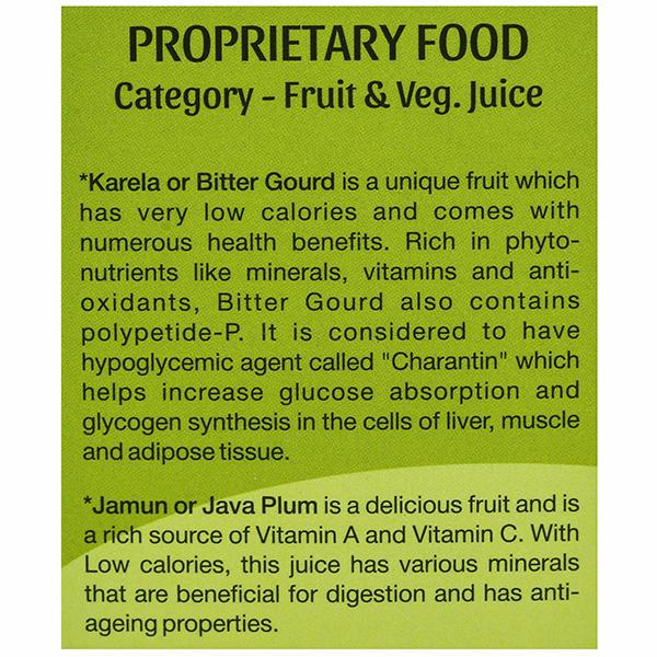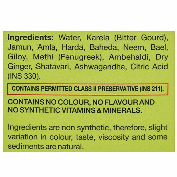 Water, Karela (Bitter Gourd), Jamun, Amla, Harda, Baheda, Neem, Bael, Giloy, Methi (Fenugreek), Ambehaldi, Dry Ginger, Shatavari, Ashwagandha, Citric Acid (INS 33)., Ingredients are non synthetic, therefore, slight variation in colour, taste, viscosity and some sediments are natural.