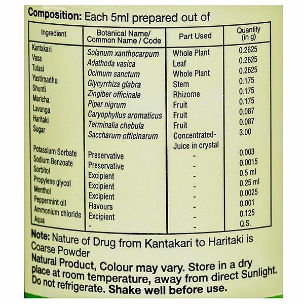 Kantakari, Vasa, Tulsi, Yastimadhu, Shunti, Maricha, Lavanga, Haritaki, Sugar, Potassium Sorbate, Sodium Benzoate, Sorbitol, Propylene Glycol, Menthol, peppermint oil, Ammonium chloride, Aqua