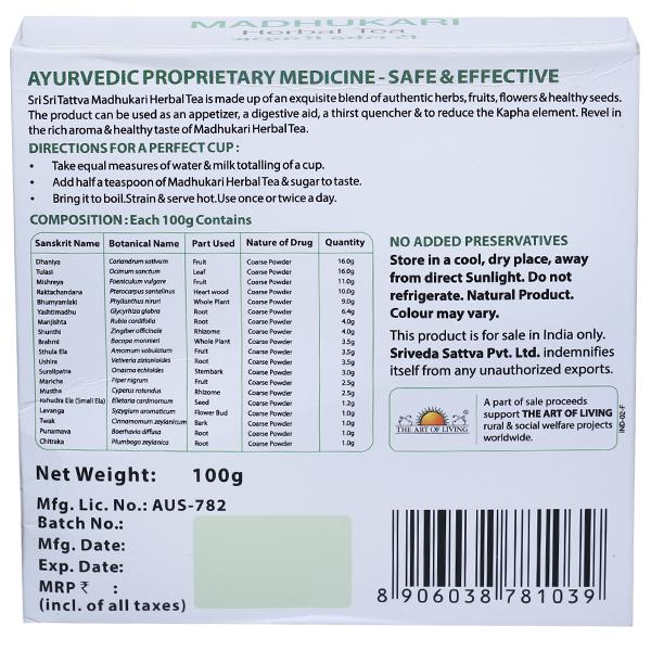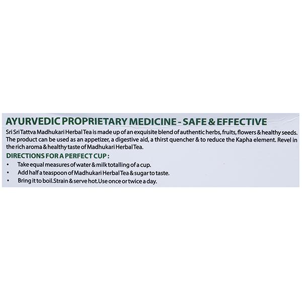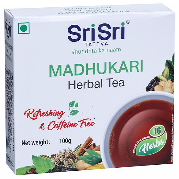 Sri Sri Tattva Madhukari herbal tea is made up of an exquisite blend of authentic herbs, fruits, flowers & healthy seeds. The product can be used as an appetizer, a digestive aid & a thirst quencher & to reduce the kapha element. Revel in the rich aroma & healthy taste of Madhukari herbal tea.