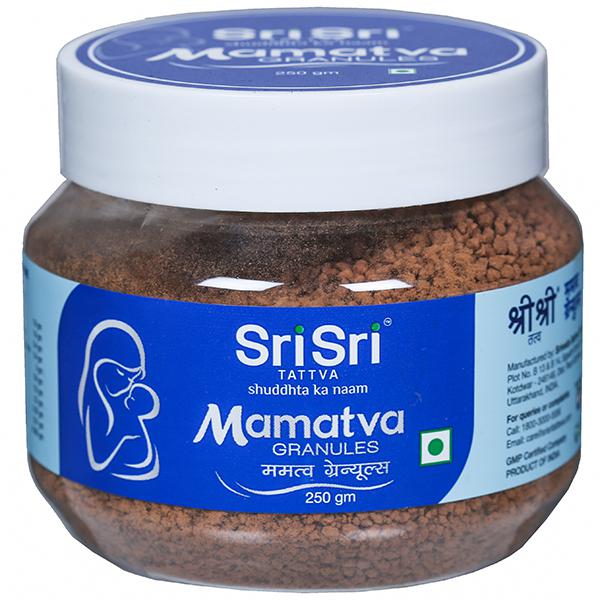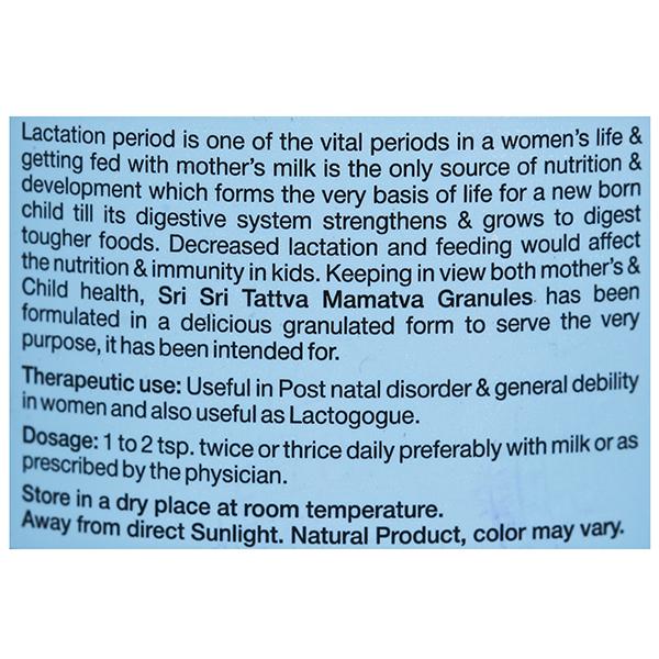 The lactation period is one of the vital periods in a women's life and getting fed with mother's milk is the only source of nutrition and development that forms the very basis of life for a newborn child till its digestive system strengthens and grows to digest tougher foods. Decreased lactation and feeding would affect the nutrition and immunity of kids. Keeping in view both mother's and Child's Health, Sri Sri Tattva Mamatva Granules has been formulated in a delicious granulated form to serve the very purpose, it has been intended for therapeutic use. It is useful in post-natal disorders & general debility in women & also useful as Lactogogue.
