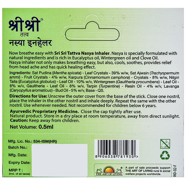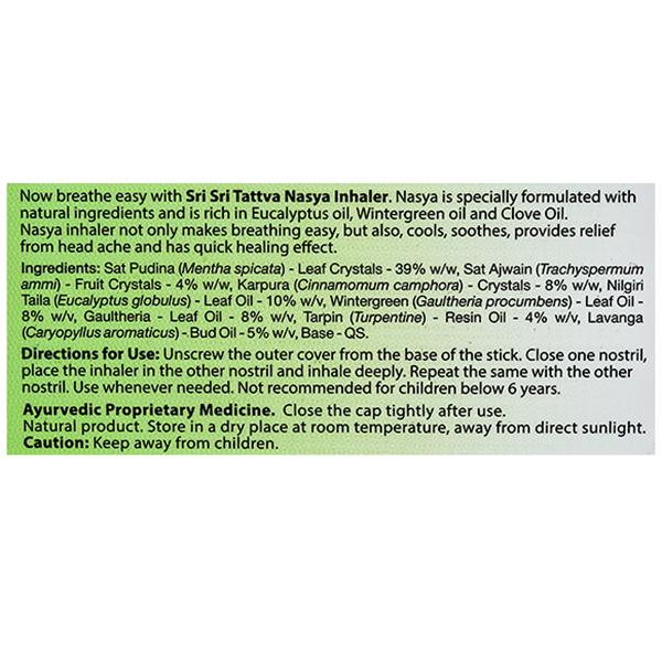 Product Information - Now breathe easy with Sri Sri Tattva Nasal Inhaler - Nasya, specially formulated with natural ingredients. Rich in Eucalyptus oil, Wintergreen oil and Clove oil, Nasya Inhaler not only makes breathing easy but also cools, soothes, provides relief from headache and has quick healing effect.