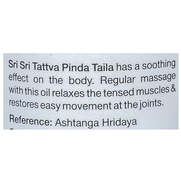 Product Information - Sri Sri Tattva Pinda Taila has a soothing effect on the body. Regular massage with this oil relaxes the tensed muscles & restores easy movement at the joints.