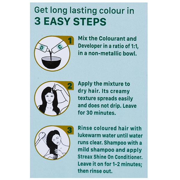 It is enriched with the natural goodness of Argan oil & Walnut oil, Streax cream hair colour imparts a rich & radiant colour, effectively covers greys, & makes hair softer, shinier & glossier. Walnut oil is known to enhance the natural radiance of hair & Argan oil is known to seal in moisture, thus making hair softer.