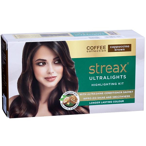 Adorn trendy and colorful hair with the Streax Coffee Collection Ultralights Highlighting Kit - Cappuccino Brown (40gm+40ml). It contains a sachet of blonder powder and a developer that makes highlighting hair at home a breeze. This nourishing highlighter is infused with walnut and argan oil to offer healthy and long-lasting color. This Streax highlighter also imparts beautiful shine and smoothness to the hair, making it easily manageable.
