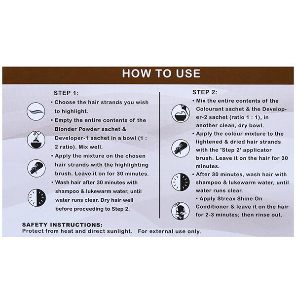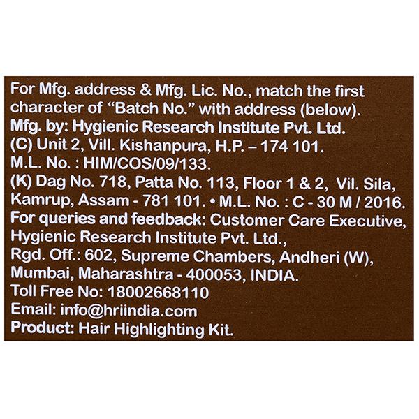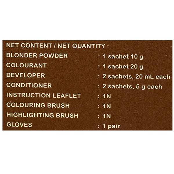 Number of Contents in a Sales Package - 1N Blonder Powder 10 g, 1N Colourant 20 g, 2N Developer 20 ml each, 2N Conditioner 5 g each, 1N Instruction Leaflet, 1N Colouring Brush, 1N Highlighting Brush, 1 Pair of Gloves