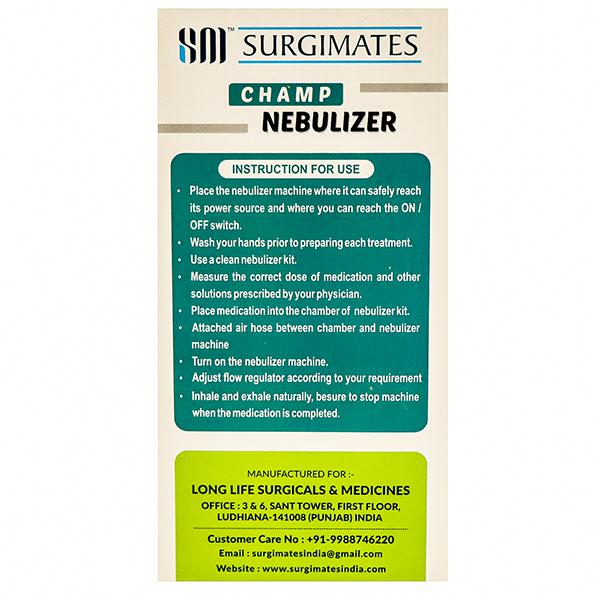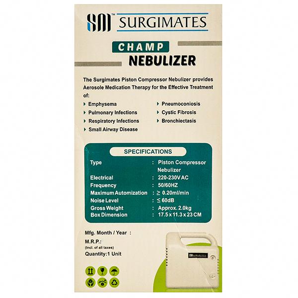 Surgimates Champ Piston Compressor Nebulizer is an effective drug delivery device used for the treatment of emphysema, pneumoconiosis, pulmonary infections, cystic fibrosis, respiratory infections, bronchiectasis and small airway disease.