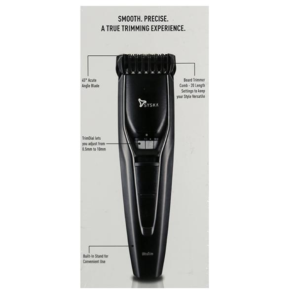 Product Information - The Syska Ultra Trim Beard Pro Trimmer comes with skin friendly stainless steel blades for a smooth trimming experience. The blades have a unique self-sharpening technology wherein the blades brush against each other, sharpening themselves as they trim so they stay sharp and effective from 1st use. The LED indicator lets you know when it is charging by a red color light and when it is fully charged it turns green. If the charge of the trimmer goes below 10%, the light will turn red to indicate that it needs to be charged.