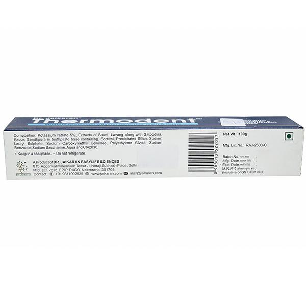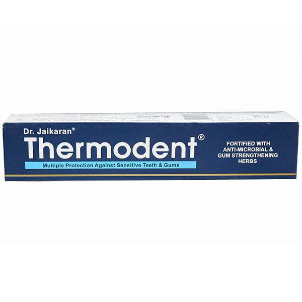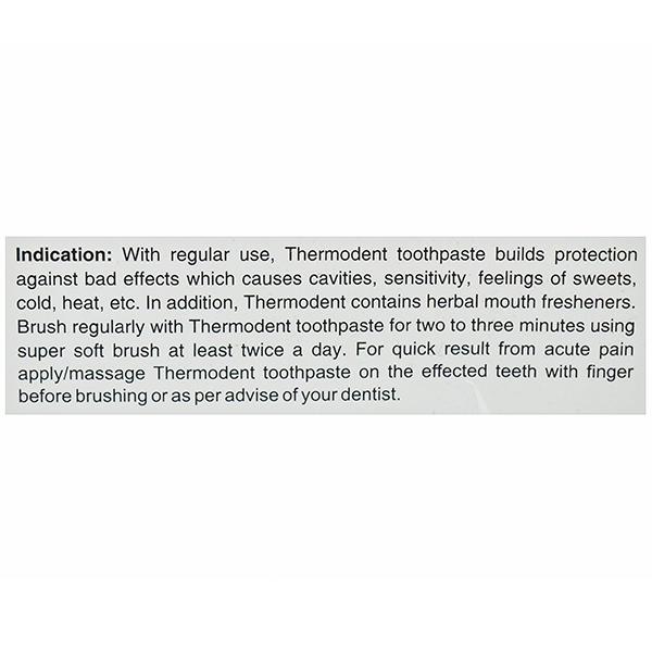 Thermodent Tooth Paste builds protection against bad effects which causes cavities, sensitivity, feelings of sweets, cold, heat, etc. In addition, it contains herbal mouth freshener. It provides relief from acute pain of teeth, fortified with anti-microbial & gum strengthening herbs.