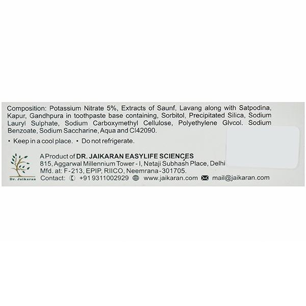 Potassium Nitrate 5%, Extracts of Saunf, Lavang along with Satpodina, Kapur, Gandhpura in toothpaste base containing Sorbitol, Precipitated Silica, Sodium Lauryl Sulphate, Sodium Carboxymethyl Cellulose, Polyethylene Glycol, Sodium Benzoate, Sodium Saccharine, Aqua and Cl42090.