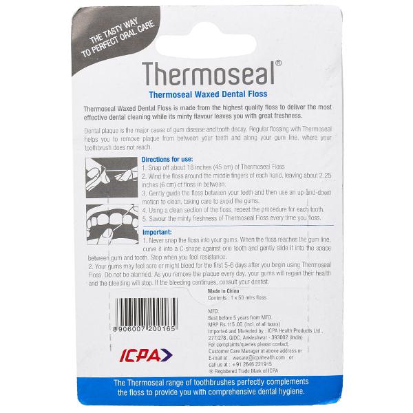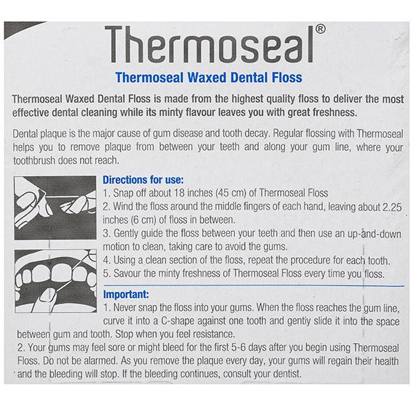 Thermoseal Floss is a waxed dental floss that provides effective dental cleaning. It remove plaque from between teeth and along gum line, where the toothbrush does not reach. It is a tasty way for perfect oral care and its minty flavour gives a fresh feeling.