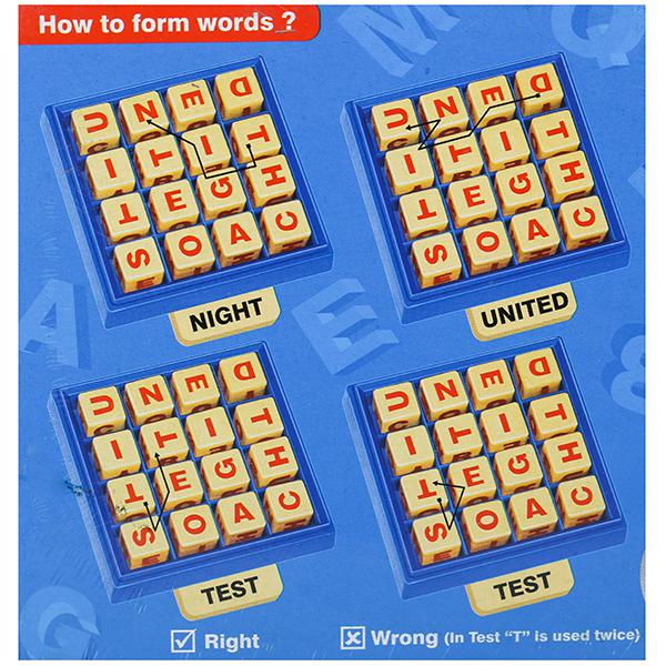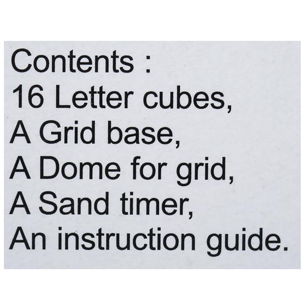 No of content in a sales package- 16 Letter Cubes , 1 Grid Base , 1 Dome For Grid , 1 Sand Timer , 1 Instruction Guide.
