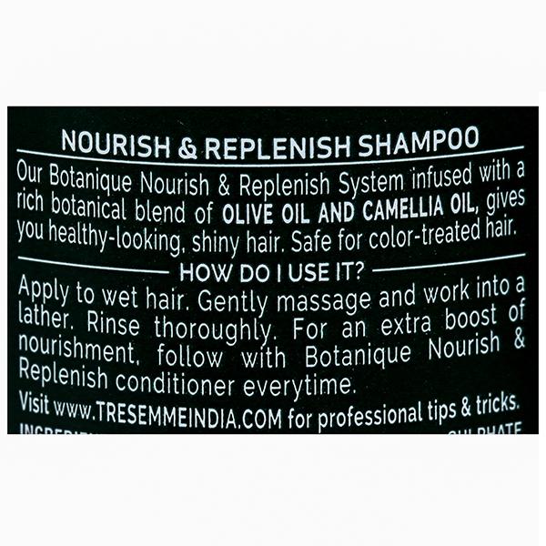The TRESemmé BOTANIQUE Nourish & Replenish shampoo gently cleanses hair while leaving it looking and feeling nourished. This shampoo is free from parabens, dyes and silicones and enriched with our botanical blend of coconut milk, coconut oil and aloe vera. Our professional-quality formula simultaneously cleanses and quenches hair each time you lather up- for healthy looking hair.