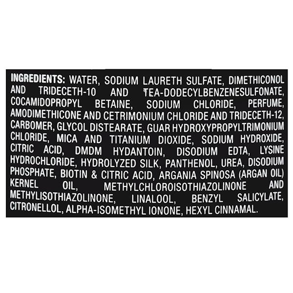 Water, Sodium Laureth Sulfate, Dimethiconol and Tea-Dodecylbenzenesulfonate, Cocamidopropyl Betaine, Perfume, Sodium Chloride, Carbomer, Glycol Distearate, Guar Hydroxypropyl Trimonium Chloride, Mica and Titanium Dioxide, Disodium Edta, DMDM Hydantoin, Urea, Disodium Phosphate, Biotin (Vit H), Lysine Hydrochloride, Panthenol, Hydrolyzed Silk, Argania Spinosa Kernel (Argan) Oil, Methylchloroisothiazolinone and Methylisothiazolinone, Sodium Hydroxide.