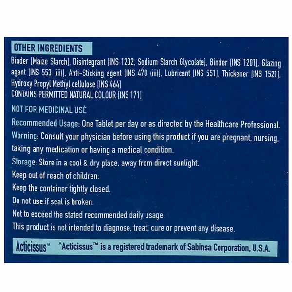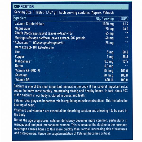Calcium Citrate Malate: 1000 mg, Magnesium: 75 mg, Alfalfa (Medicago sativa) leaves extract (10:1): 45 mg, Moringa (Moringa oleifera) leaves ertract-20% protein: 40 mg, Acticissus (Cissus quadrangularis) stem extract-10% Ketosterone: 25 mg, Zinc: 5 mg, Copper: 1 mg, Manganese: 0.5 mg, Boron: 0.3 mg, Vitamin K2-(MK-7): 55 mcg, Selenium: 40 mcg, Vitamin D3: 400 IU