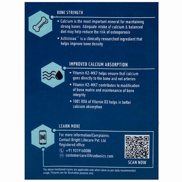 Truebasics Advance Calcium Tablet contains calcium is one of the most important mineral in the body. It has several important roles within the body. About 99% of the calcium is stored in bones and teeth in the body and maintains strong and healthy bones. It plays an important role in regulating muscle contractions. It is enriched with vitamin D3, vitamin K2-MK7 & alfalfa and helps in the management of bones and joint health. Vitamin D and vitamin K are essential for absorbing calcium and allowing it to be used in the body.