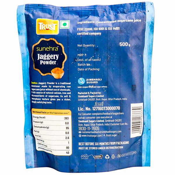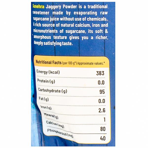 Trust Sunehra Jaggery Powder is a traditional sweetener made by evaporating raw sugarcane juice without use of chemicals. A rich source of natural calcium, iron and micronutrients of sugarcane, its soft & amorphous texture gives a richer, deeply satisfying taste.