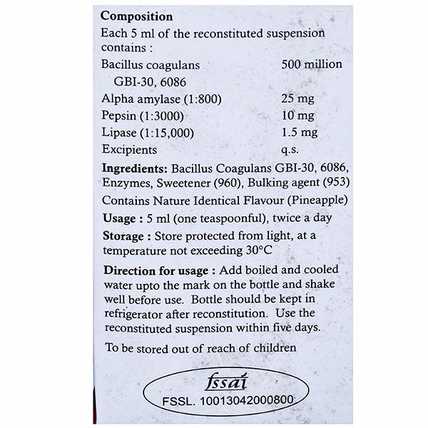 Bacillus coagulans GBI-30, 6086: 500 million, Alpha amylase (1:800): 25 mg, Pepsin (1:3000): 10 mg, Lipase (1:15000): 1.5 mg, Excipients: q.s.