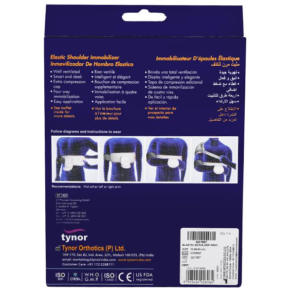 Tynor Elastic Shoulder Immobilizer is a lightweight, sleek and smart design to provide immobilization in shoulder dislocation and post operative rehabilitation of the shoulder . It reduces abduction and arm rotation by positioning the arm close to the body.