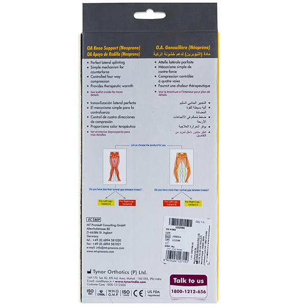 Product Information - Tynor OA Knee Support is designed scientifically to provide counter force to correct varus or valgus thrust along with some offloading action. It helps to allay pain within a few weeks of use. It can also correct mild to medium varus/ valgus deformity of the knee with a prolonged use.