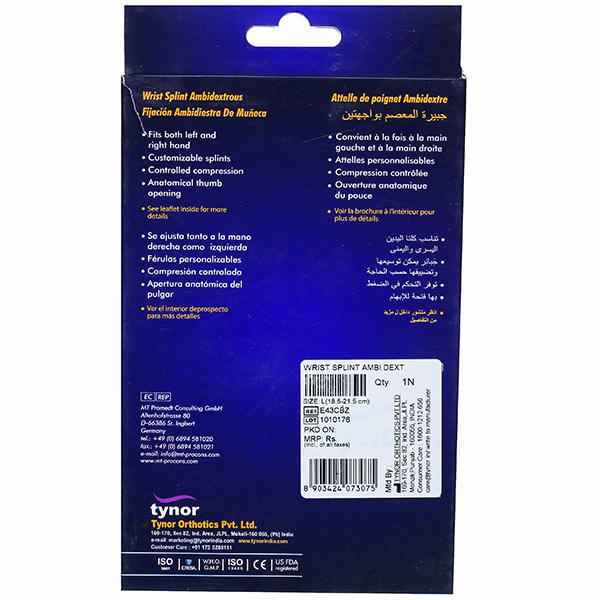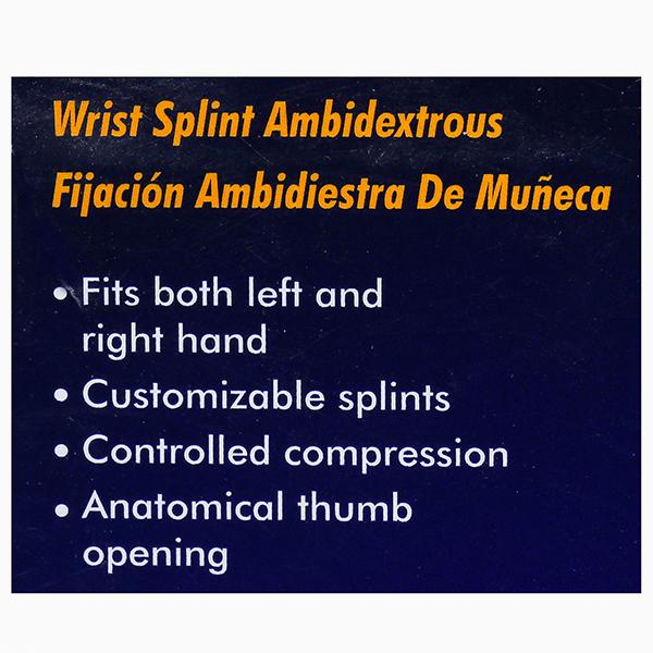 Wrist Splint Ambidextrous is designed to immobilize and provide firm support to hand and wrist in various orthopedic conditions. It immobilizes the wrist in the dorsi-flexion/functional position while allowing full range of motion to fingers and thumb. It compresses and retains the body heat to allay the local pain and inflammation. The product can be removed to permit, therapy sessions, washing and hygiene.