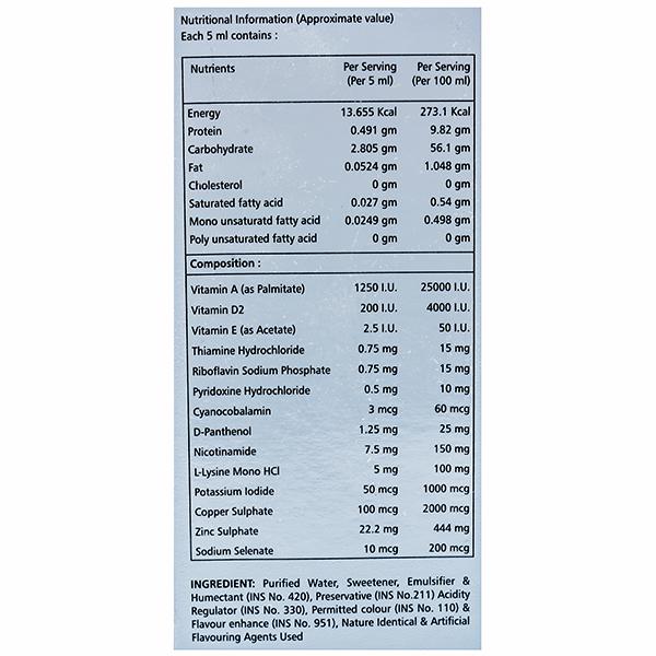 Vitamin A (as Palmitate) 1250IU/5ml + Vitamin D2 200IU/5ml + Vitamin E (as Acetate) 2.5IU/5ml + Thiamine Hydrochloride 0.75mg/5ml + Riboflavin Sodium Phosphate 0.75mg/5ml + Pyridoxine Hydrochloride 0.5mg/5ml + Cyanocobalamin 3mcg/5ml + D-panthenol 1.25mg/5ml + Nicotinamide 7.5mg/5ml + L-lysine Mono Hcl 5mg/5ml + Potassium Iodide 50mcg/5ml + Copper Sulphate 100mcg/5ml + Zinc Sulphate 22.2mg/5ml + Sodium Selenate 10mcg/5ml