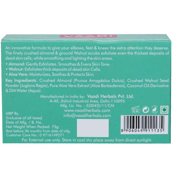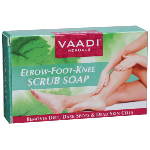 Vaadi Herbals Elbow Foot Knee Scrub Soap is an innovative formula to give your elbows, feet & knees the extra attention they deserve. Specialized formula which helps to clear out the dead skin from the elbows, knees and foot making them softer, cleaner and fairer.