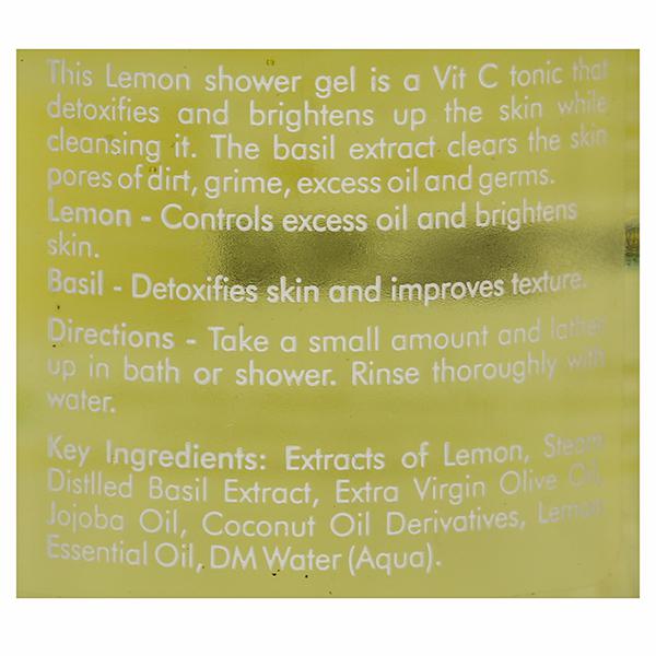 Product Information - This lemon shower gel is a vitamin c tonic that detoxifies and brightens up the skin while cleansing it. The basil extract clears the skin pores of dirt, grime, excess oil and germs.
