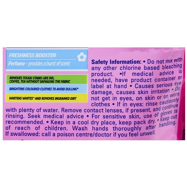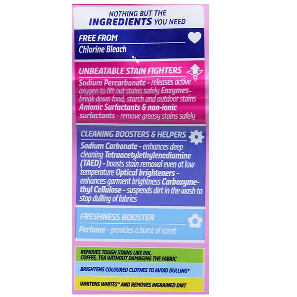 Ingredients: Free from Chlorine Bleach, Sodium Percarbonate, Anionic Surfactants & non-ionic surfactants, Sodium Carbonate, Tetraacetylethylenediamine(TAED),Optical Brighteners, Carboxymethyl Cellulose, Perfume