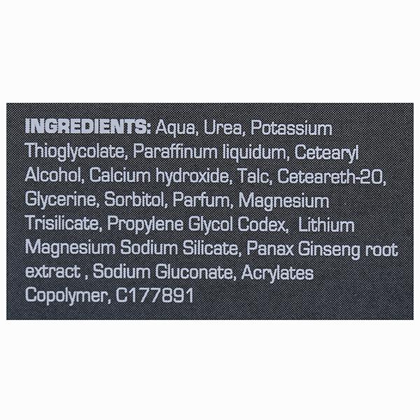 Aqua, Urea, Potassium Thioglycolate, Paraffinum liquidum, Cetearyl Alcohol, Calcium hydroxide, Talc, Ceteareth-20, Glycerine, Sorbitol, Parfum, Magnesium Trisilicate, Propylene Glycol Codex, Lithium Magnesium Sodium Silicate, Panax Ginseng root extract , Sodium Gluconate, Acrylates Copolymer, CI77891