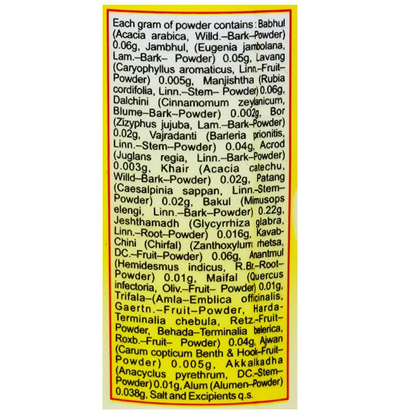 Vicco Vajradanti Powder, a perfect blend of 18 Ayurvedic herbs and Barks like Babhul, Jambhul, Lavang, Bor, Manjishtha, Acrod, Jeshthamadh, Ajwan, Vajradanti, Dalchini, Bakul etc, is a supreme Ayurvedic medicine for gums and teeth. Being a natural product, each and every medicinal ingredient used in this powder is very beneficial for good health of your teeth and to build strong gums without any side effects. For perfect dental care, teeth are first to be brushed with Vicco Vajradanti paste and then the gums are to be massaged with Vicco Vajradanti powder. While the paste removes food particles from the cavities and crevices of the teeth, the powder strengthens your gums by allowing the essences from 18 rich herbs to percolate down the gum layers. It also helps to treat pyorrhoea, swollen and bleeding gums and other periodontal disorders. The 'twin therapy' rejuvenates teeth and gums to give a never fading smile.