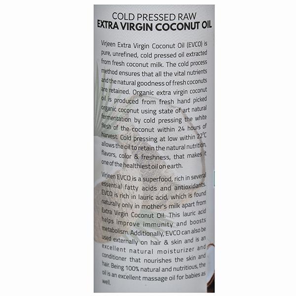 Virjeen EVCO is a superfood, rich in several essential fatty acids & antioxidants. EVCO is rich in lauric acid, which is found naturally only in mother's milk apart from extra virgin coconut oil. This lauric acid helps improve immunity & boosts metabolism. Additionally, EVCO can also be used externally on hair & skin & is an excellent natural moisturizer & conditioner that nourishes the skin & hair, being 100% natural & nutritious, the oil is an excellent massage oil for babies as well.