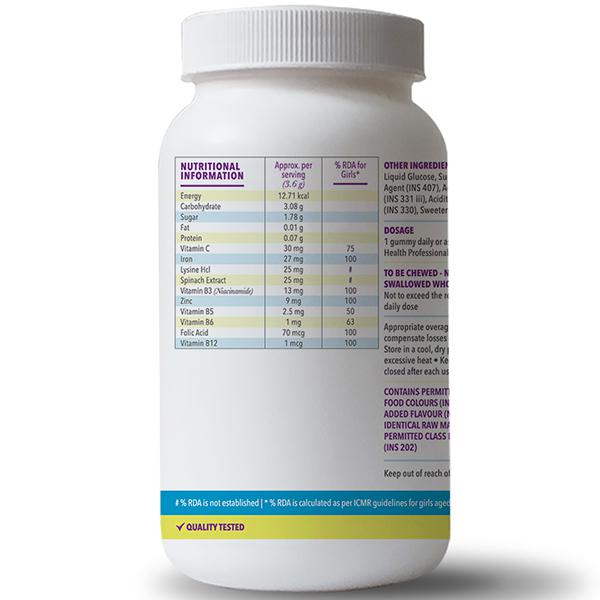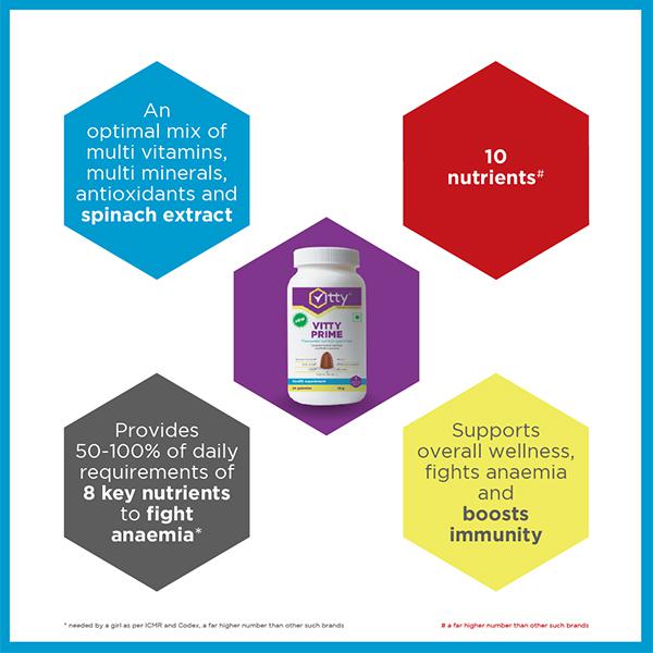 Product Information Vitty Prime is a premium immunity boosting Flavoured and chewable Nutrition Gummy for adults and children aged 5 years and above. It supports overall wellness, fights anaemia and strengthens immunity. It contains premium nutrients in forms that the body can easily process. It contains the largest number of nutrients (10 premium nutrients) with the highest values within the Recommended Dietary Allowance (RDA) limits (as specified by ICMR & Codex), of all such brands, all in just one fun and tasty gummy that is convenient to eat as compared to dull and boring syrups, tablets and capsules. It contains Spinach Extract, Iron, Folic Acid, Zinc, Vitamins C, B3, B5, B6, B12 (Methylcobalamin), Lysine It provides over half to a full day’s requirement of 8 key nutrients required by a girl to fight anaemia. It helps improve overall health, strengthens immunity, boosts metabolism and prevents iron and vitamin deficiencies. It improves appetite, reduces fatigue, maintains energy levels and counters stress. It helps fight anaemia, increases haemoglobin level and keeps the body energized and active while supporting the nervous system. It is useful during recovery from illness and also for women during pregnancy and surgery.