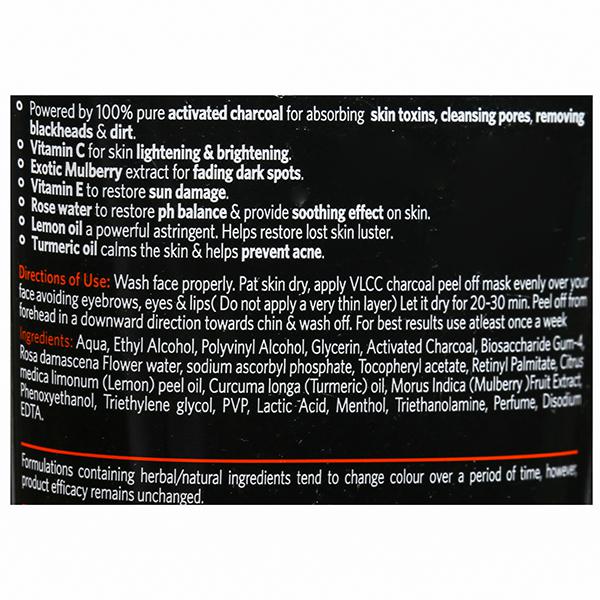 Wash the face properly. Pat skin dry, then apply VLCC charcoal peel-off mask evenly over your face avoiding eyebrows, eyes & lips (Do not apply a very thin layer) & let it dry for 20 - 30 minutes. Peel off from forehead in a downward direction towards chin & wash off. For best results use at least once a week