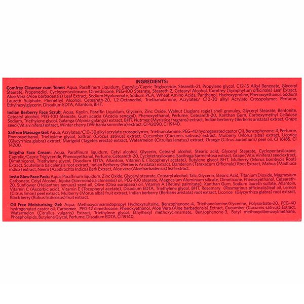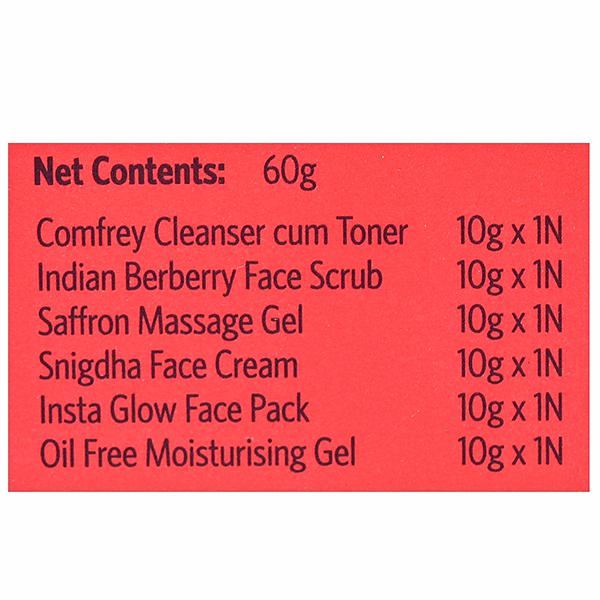 Number of Contents in a Sales Package - 1N Comfrey Cleanser cum Toner 10 g, 1N Indian Berberry Face Scrub 10 g, 1N saffron Massage Gel 10 g, 1N Snigdha Face Cream 10 g, 1N Insta Glow Face Pack 10 g, 1N Oil Free Moisturizing Gel 10 g