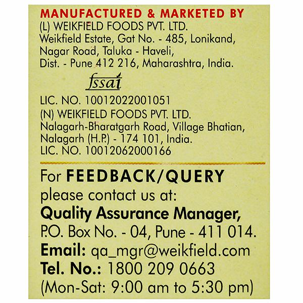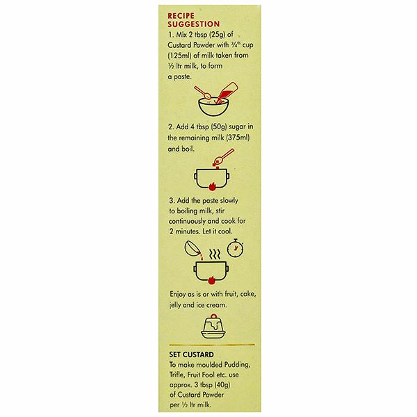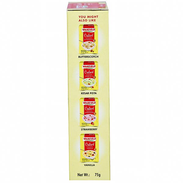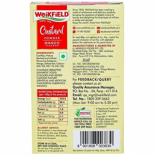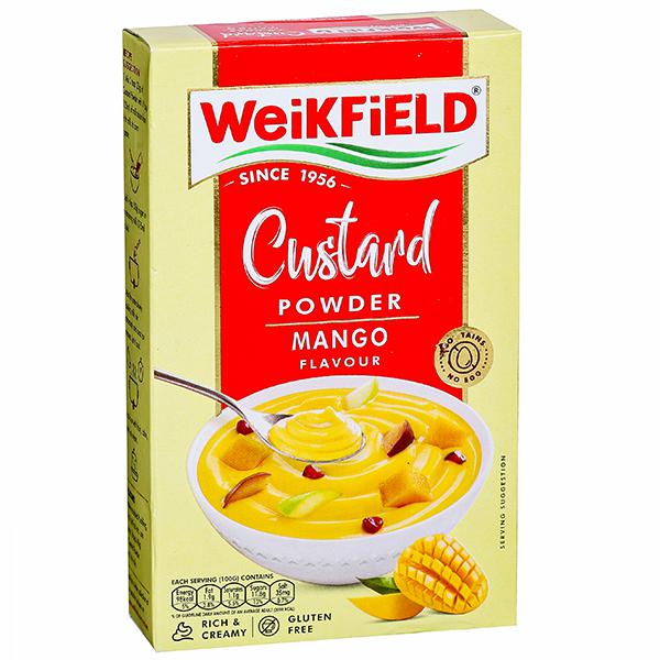 Product Information- WeikField Custard Powder MangoFlavour: How to Prepare: Trfle: 50g plain cake, 1pkt Weikfield Veg Jelly Crystals 1/2 ltr milk, 1-2 tbsps sugar, 4tbsp Weikfield Custard Powder and allow to cool Dissolve 1pkt Weikfiled Veg Jelly in 450 ml boiling water, Cut one slice (50g) from a plain cake Break the Slice into small pieces and set in the jelly, When the jelly is set pour the cool custard on top, Make the trifle topping with whipped cream and decorate with flaked almonds or cherries,