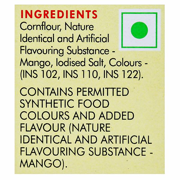 Ingredients- Cornflour, Edible Common Salt, Nature identical and artificial flavouring substance-Mango flavour Colours - INS 102, INS 110 and INS 122