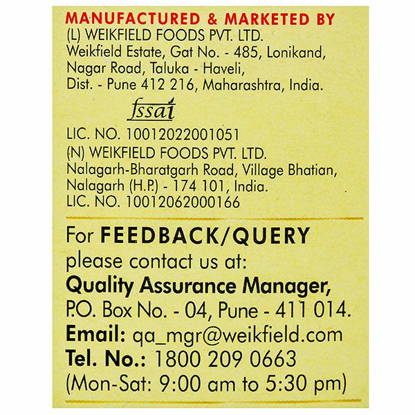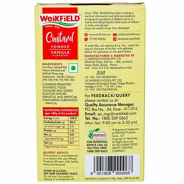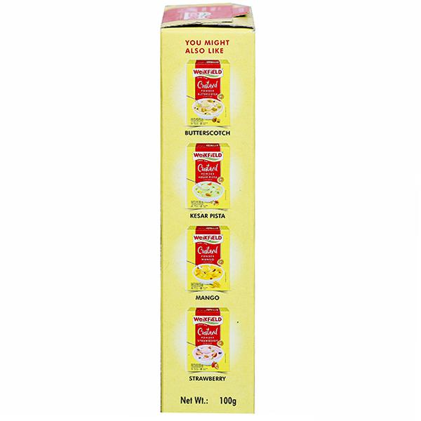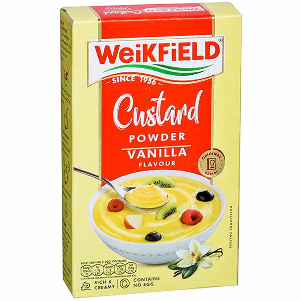 Product Information- WeikField Custard Powder Vanilla Flavour: How to Prepare: Trfle: 50g plain cake, 1pkt Weikfield Veg Jelly Crystals 1/2 ltr milk, 1-2 tbsps sugar, 4tbsp Weikfield Custard Powder and allow to cool Dissolve 1pkt Weikfiled Veg Jelly in 450 ml boiling water, Cut one slice (50g) from a plain cake Break the Slice into small pieces and set in the jelly, When the jelly is set pour the cool custard on top, Make the trifle topping with whipped cream and decorate with flaked almonds or cherries,