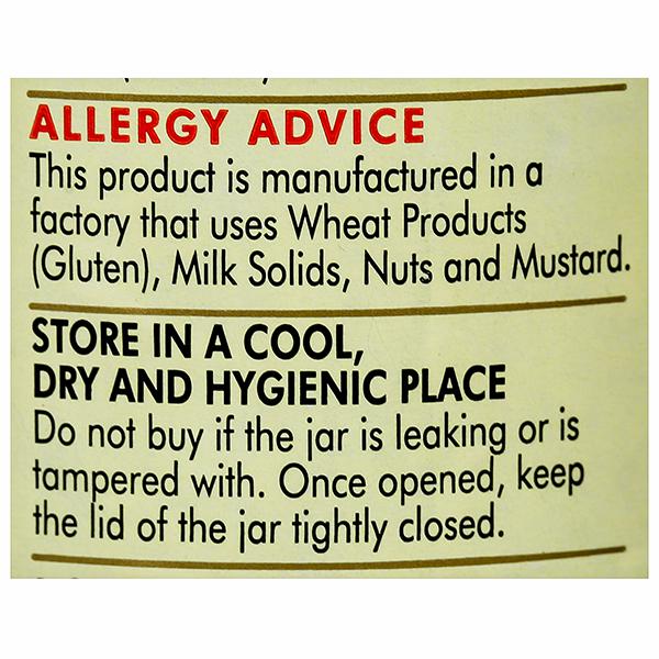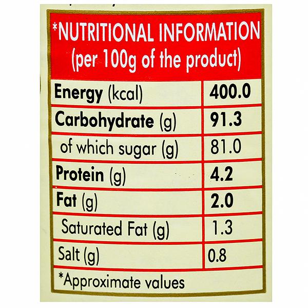 Nutritional Information- Per 100g, of product, Energy 400 kcal, Carbohydrate 91.3g, (Sugar 81g), Protein 4.2g, Fat 2.0g, Sodium 0.8g, Saturated Fat- 1.3 g