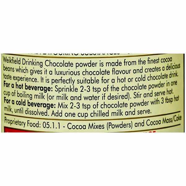 Product Information- Whip up a soothing, hot nightcap. Or use it as a flouvouring for biscuits or a rich buttercream spread. Or just sprinkle it over a steaming cappuccino or chilled caramel custard. Weikfield drinking chocolate is as versatile as it is delicious.