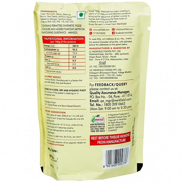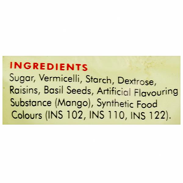 Ingredients- Sugar, Vermicelli, Starch, dextrose, Raisins, Basil Seeds, Nature Identical Flavoring Substance (Mango) ,Synthetic Food Color.