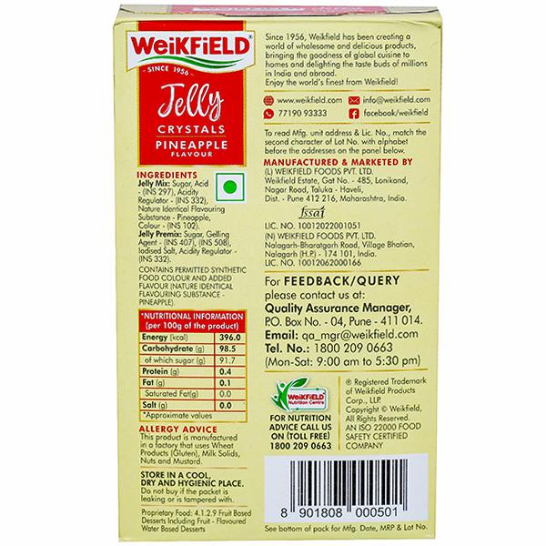 Product information- Weikfield is a reputed name in the field of desserts, culinary sauces and seasonings, as well as baking ingredients and syrups. This brand has a high quality and tasty range of products that can be used in many ways. The Weikfield Pineapple Jelly Crystals are one of the products manufactured by the brand.