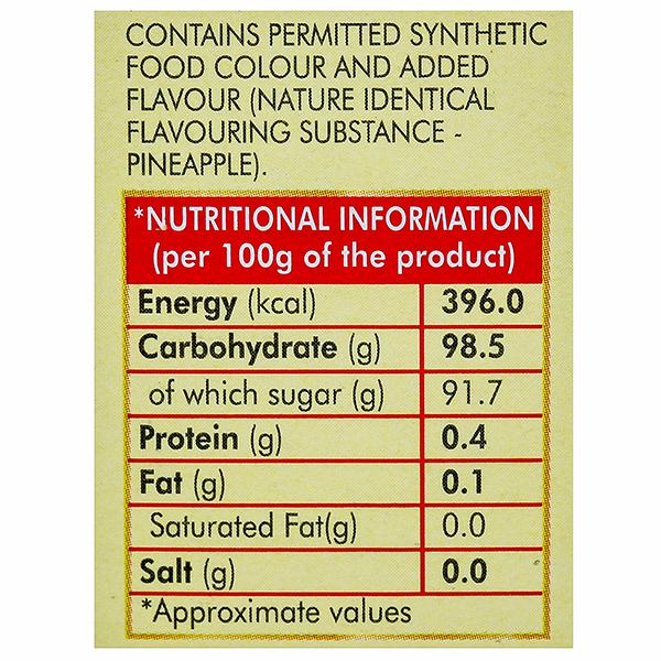 Ingredients- Sugar, acid INS 297, acidity regulator INS 332, nature identical and artificial flavouring substance- Pineapple flavour colour - INS 110.