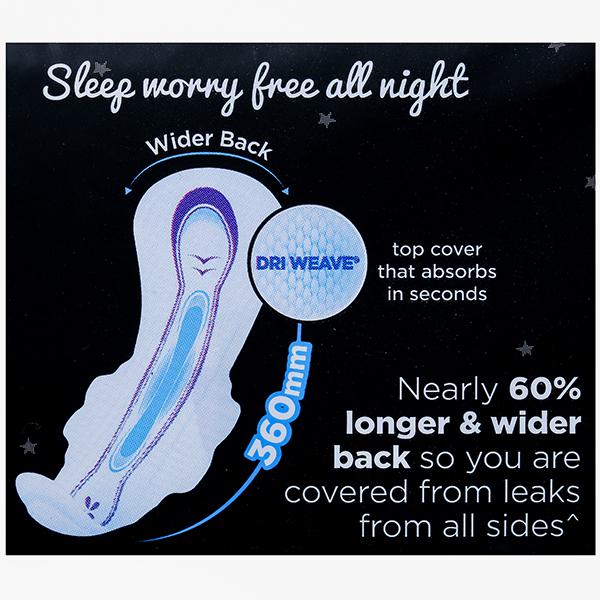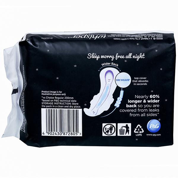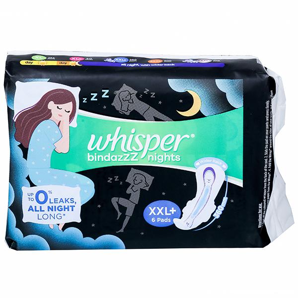 Product information- Feel protected and comfortable with Whisper Bindazzz Nights XXL Sanitary Pads with wings. These pads are nearly 20% longer* and have soft pores that drive liquid to the core and lock it away for long-lasting protection. With Whisper Ultra Soft Pads, your skin will get the care it needs and you'll get all the confidence you deserve