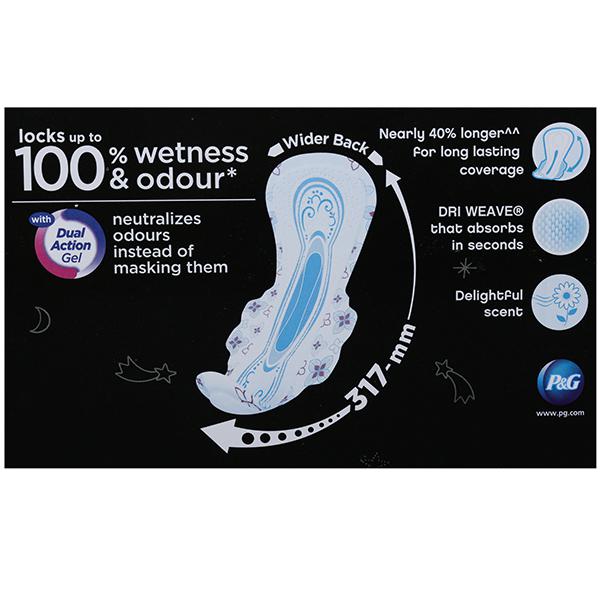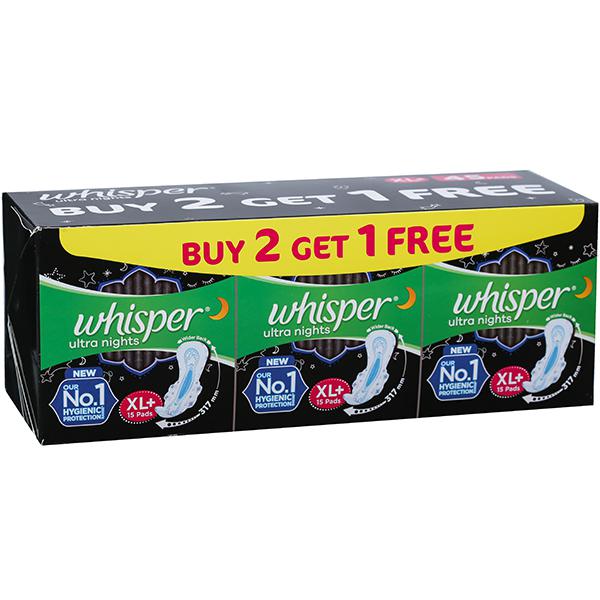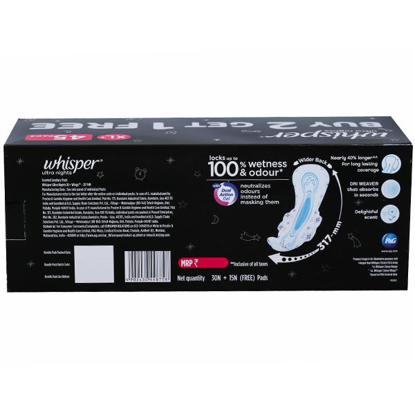 Whisper Ultra Nights XL+ helps you to stay protected throughout the night. These pads are nearly 40% longer for leak free nights. It has delightful scent for extra protection against odour.