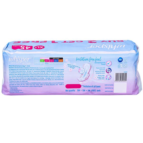 Product information - Feel protected and comfortable with Whisper Ultra Air Fresh Soft Sanitary Pads with wings. These pads are nearly 20% longer* and have soft pores that drive liquid to the core and lock it away for long-lasting protection. Whisper Ultra Air Fresh Soft Pads are two times softer** for extra gentleness and contain a soft top sheet in the centre and wings. With Whisper Ultra Soft Pads, your skin will get the care it needs and you'll get all the confidence you deserve.